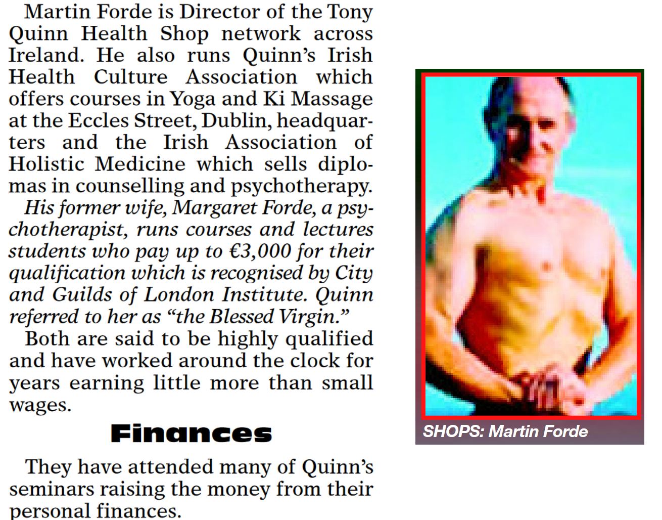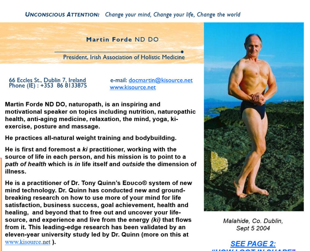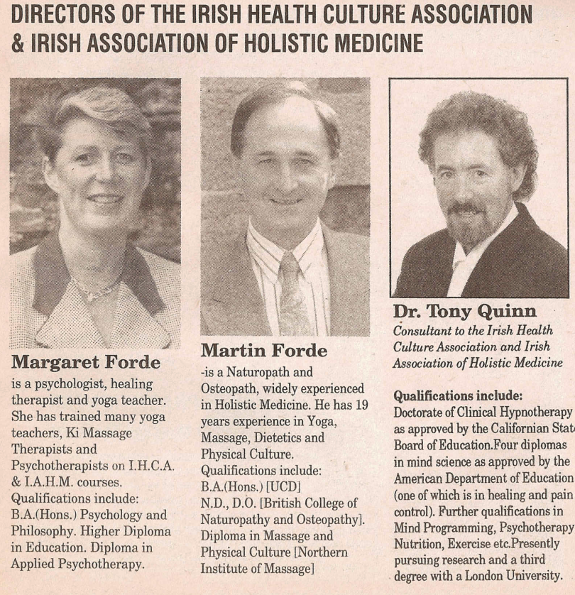 A 1998 Blueprint, published by the EDUCO Cult, stated that Forde, along with ex-wife Margaret Forde and Cult-leader “Dr” Tony Quinn were directors of The Irish Association of Holistic Medicine: