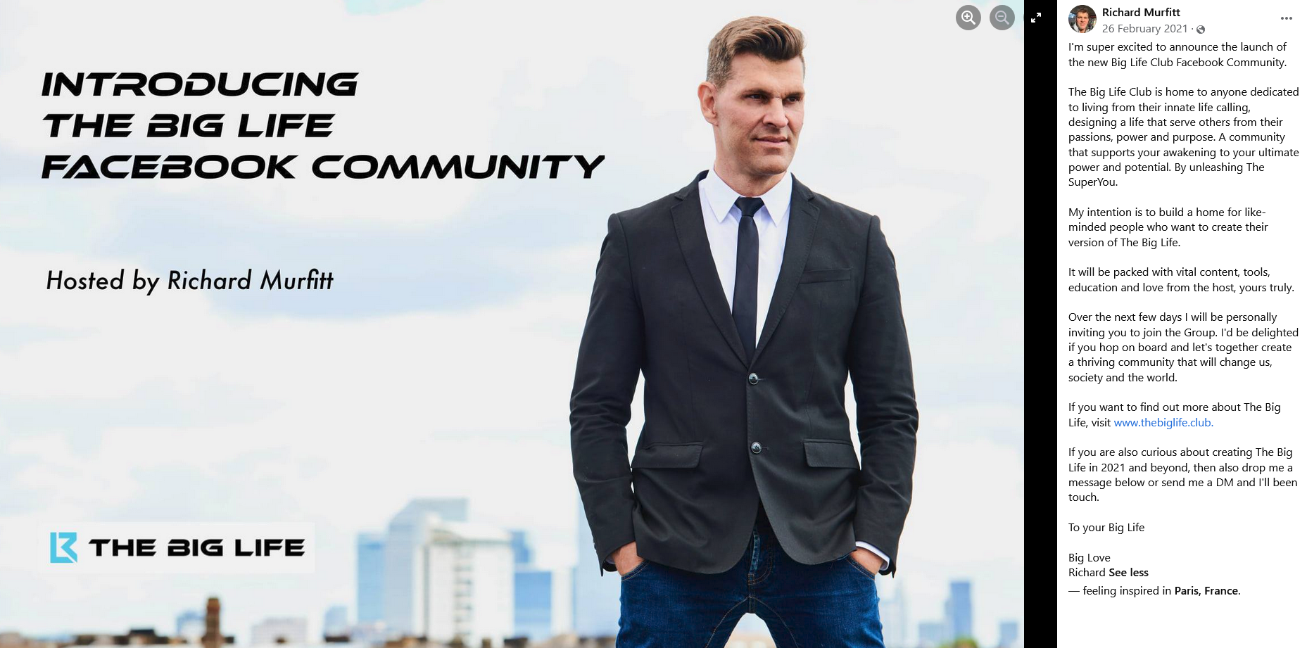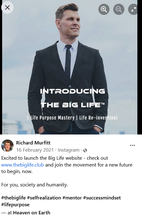 On 16th February 2021 Richard Murfitt launched The Big Life Club, Announcing on Facebook, the “Club” had been months in planning. Murfitt received the support of others associated with the EDUCO Cult including Anjum Malik, Jennifer Haskins, Madeline Paige, Mona Power, Jane Abbott (now Jayne Abbott), Stephanie Woollard, Tania Adams, Susie Heath, Pam Sidhu, Tikki Chalmers, Anne Kinsella, Mary Ann Malone, Patricia Fitzpatrick and Susan Morrice.
