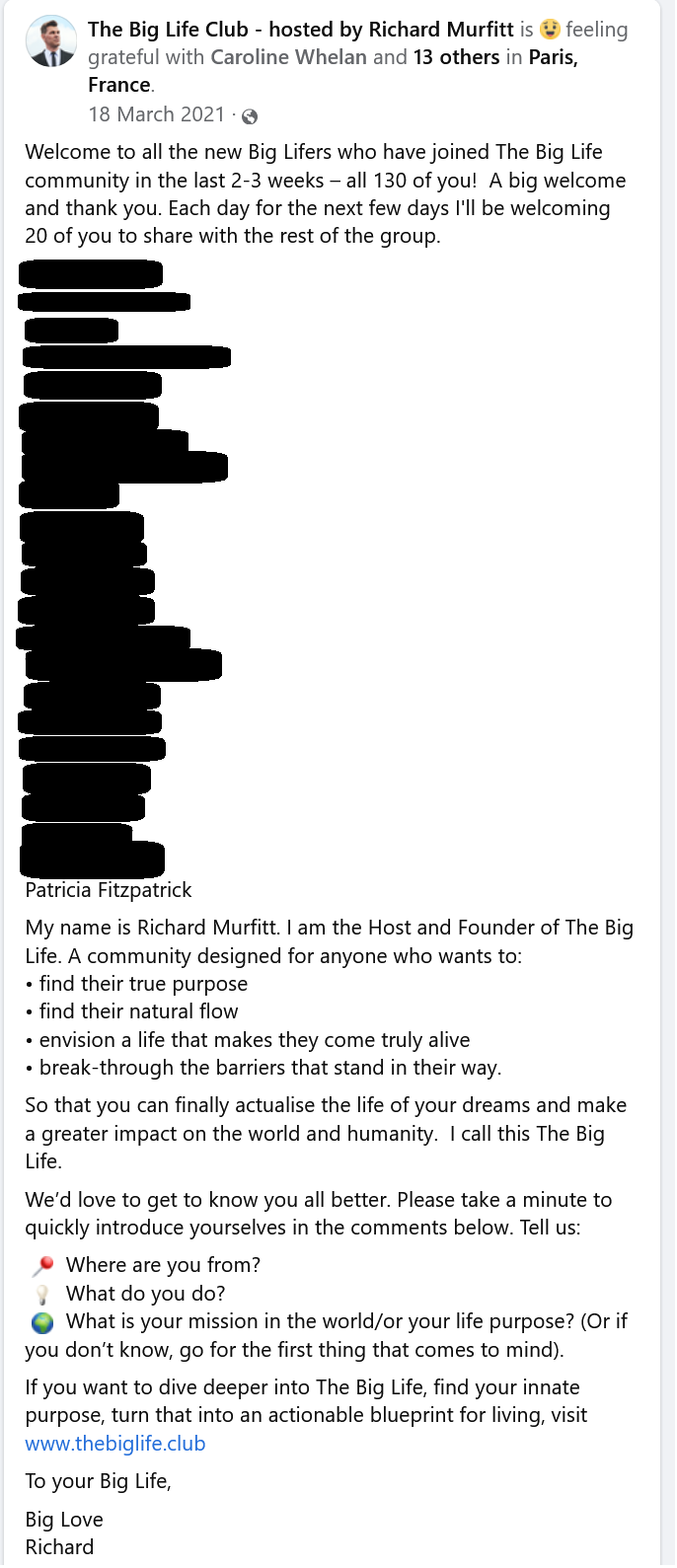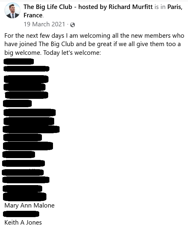 Murfitt claimed in March 2021 “Over 125 people have joined The BIG LIFE CLUB in the last 2 weeks”. Murfitt even named some of these people.
