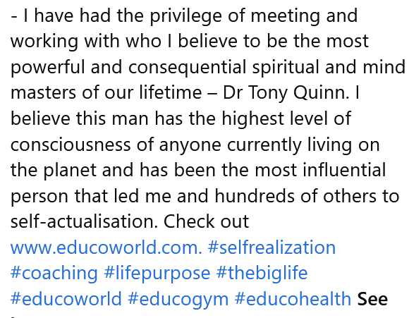 I have had the privilege of meeting and working with who I believe to be the most powerful and consequential spiritual and mind masters of our lifetime – Dr Tony Quinn. I believe this man has the highest level of consciousness of anyone currently living on the planet and has been the most influential person that led me and hundreds of others to self-actualisation. Check out www.educoworld.com.
